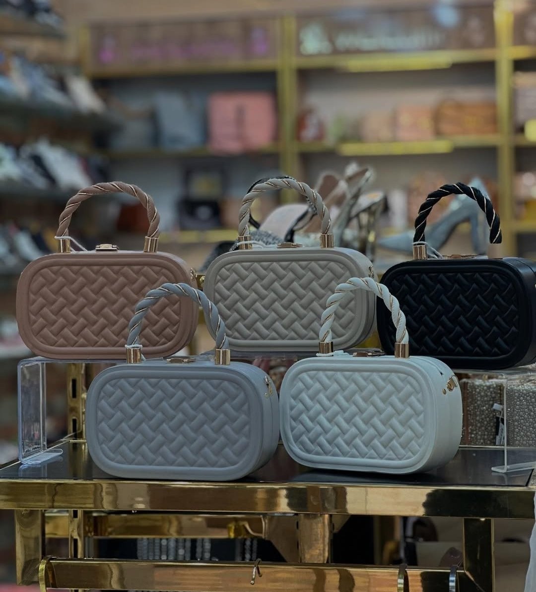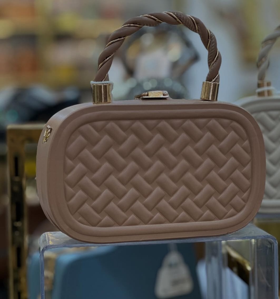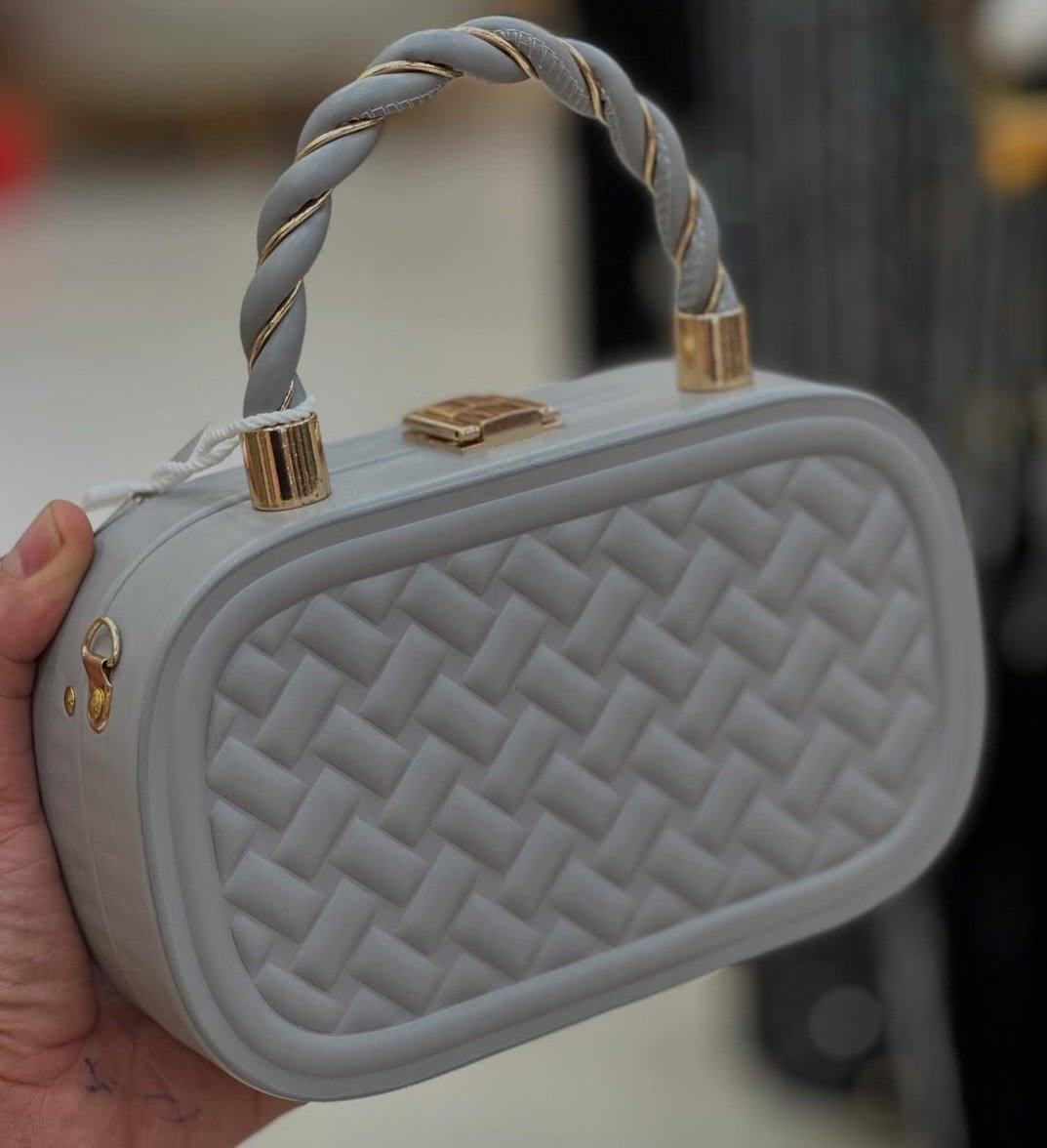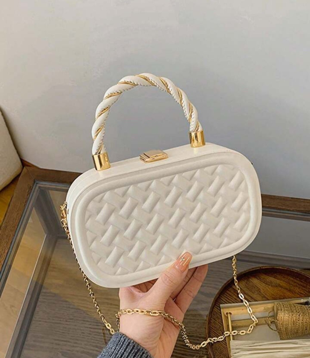Ce mini sac à main rigide allie modernité et élégance avec sa texture tressée sophistiquée. Fabriqué dans une matière lisse effet cuir, il se distingue par une finition soignée et un design chic. Doté d’une poignée torsadée ornée de détails dorés, il peut se porter à la main pour un look raffiné ou à l’épaule grâce à sa chaîne amovible.