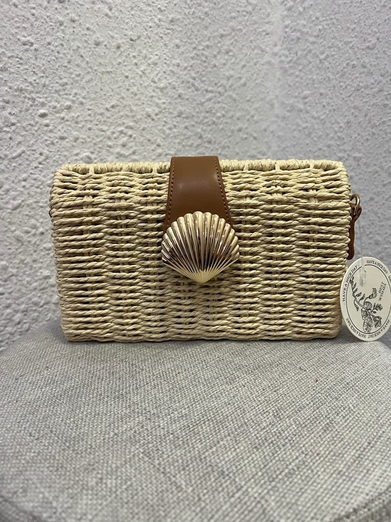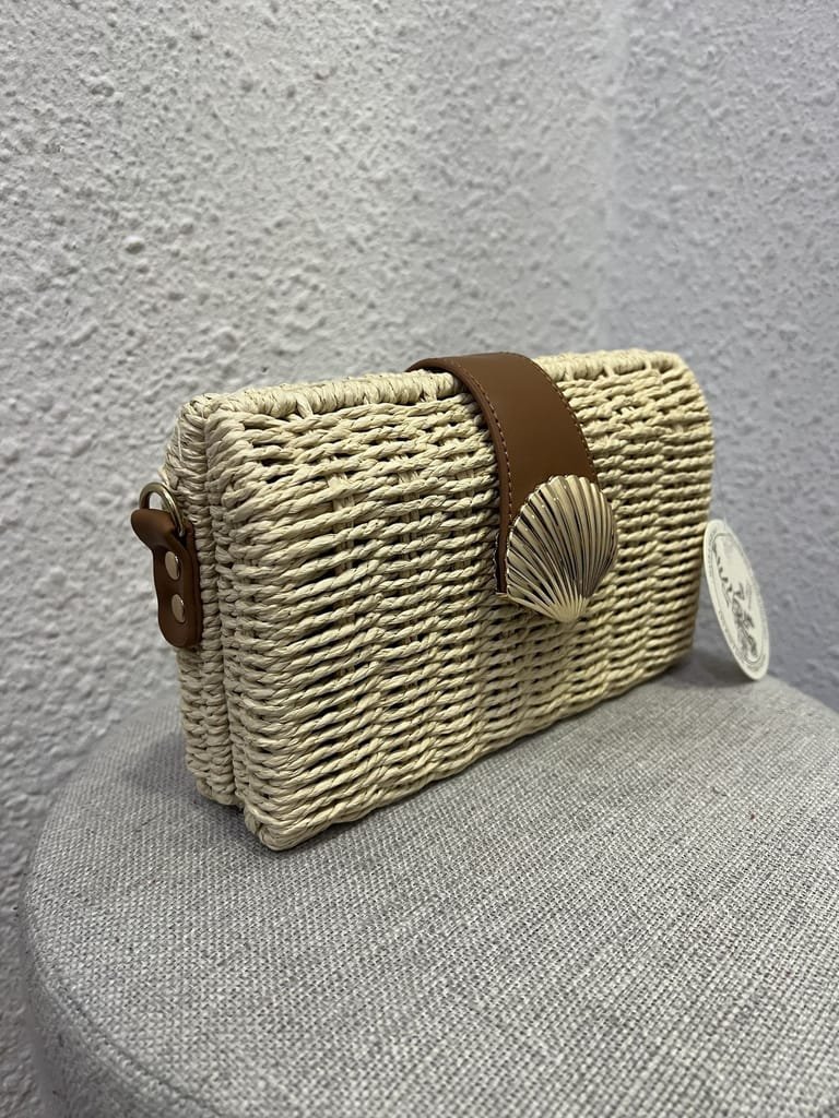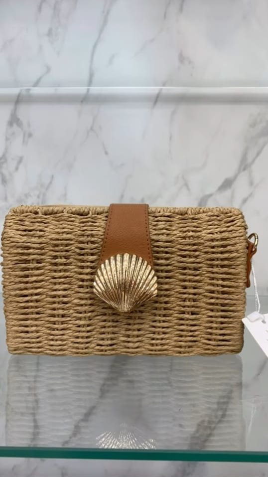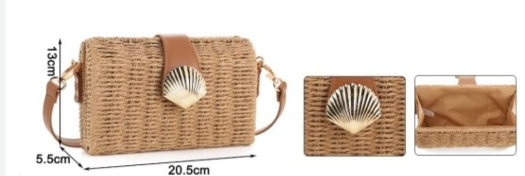Ajoutez une touche naturelle et élégante à votre look avec ce sac à main en paille tressée, orné d’un fermoir en forme de coquillage doré. Son design rectangulaire compact est à la fois pratique et tendance. La lanière en simili cuir camel apporte une belle harmonie rustique et raffinée, idéale pour la saison estivale.